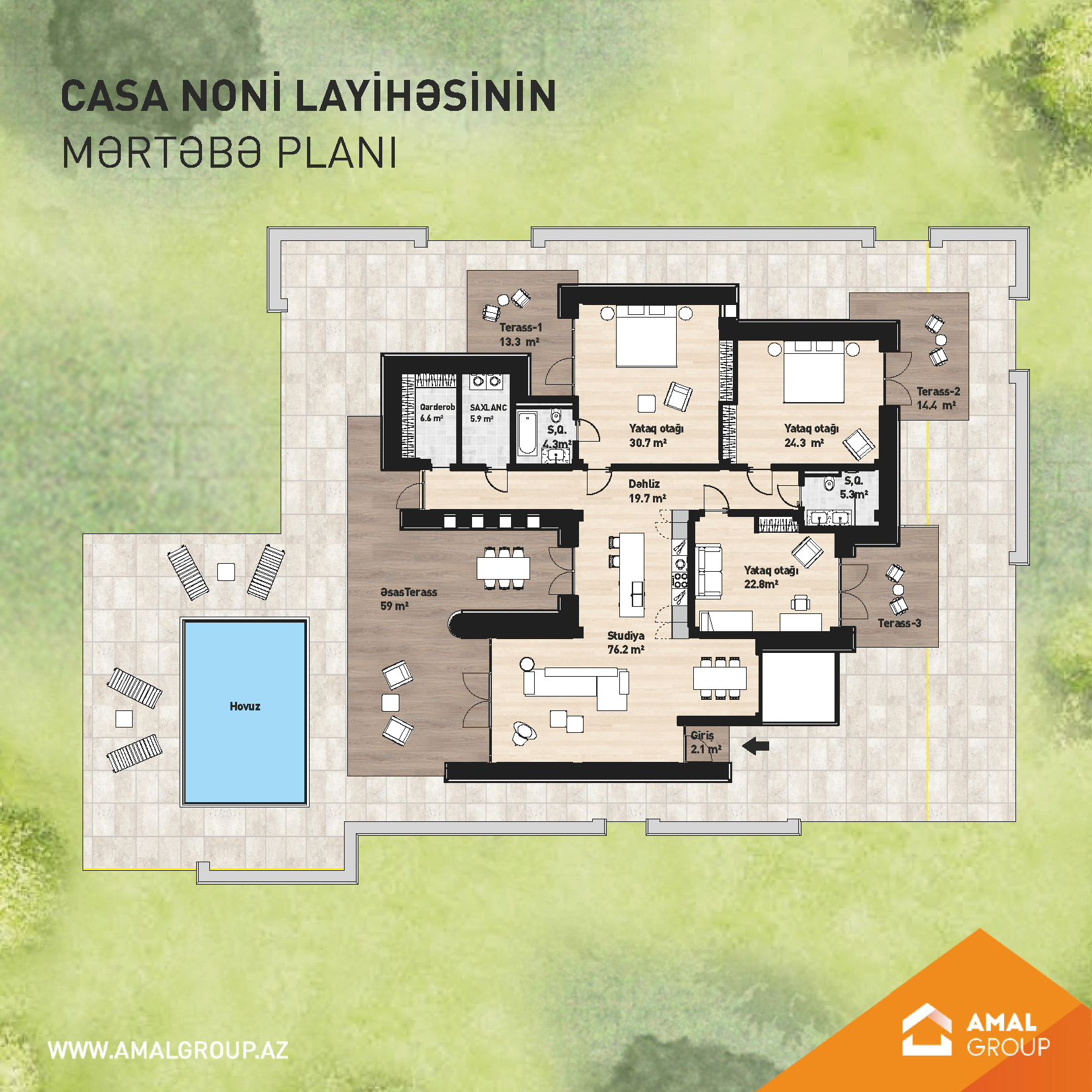 Təbiətlə ünsiyyət yaratmaq üçün layihəmizin hər bir otağından terrasa öz çıxışı var.